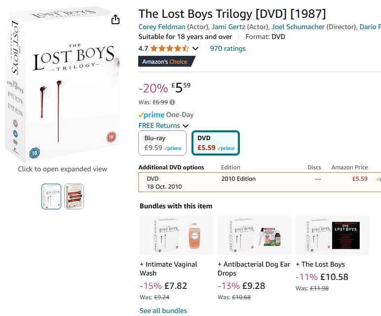 I saw this today on Amazon. I've never seen The Lost Boys. I always thought it was just about vampires, but after seeing the products this edition is bundled with, I realise I may have been barking up the wrong tree for years. Apart from a tenuous link along the lines of "vampires (and perhaps werewolves) > blood > getting the painters in", I'm stumped. Can any fans of the film check out the bundles and enlighten me?